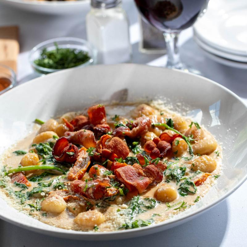 Roasted gnocchi with crispy bacon, oven roasted tomatoes and spinach in a browned butter Alfredo.