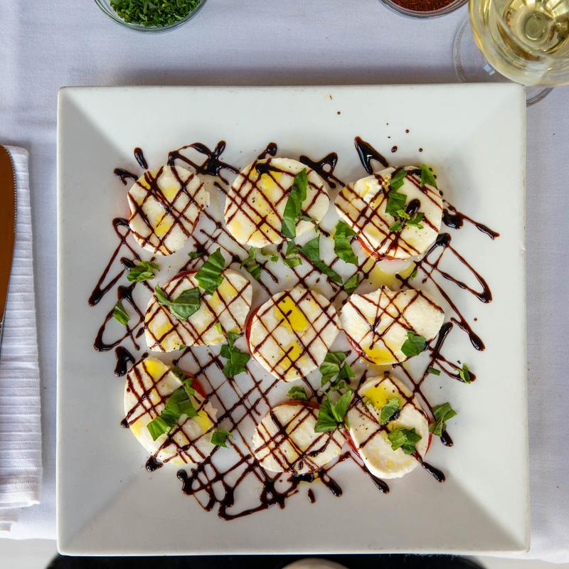 Sicilian eggplant stacked with fresh mozzarella, roasted red peppers and plum tomatoes finished with a balsamic glaze, olive oil and shaved Parmesan.