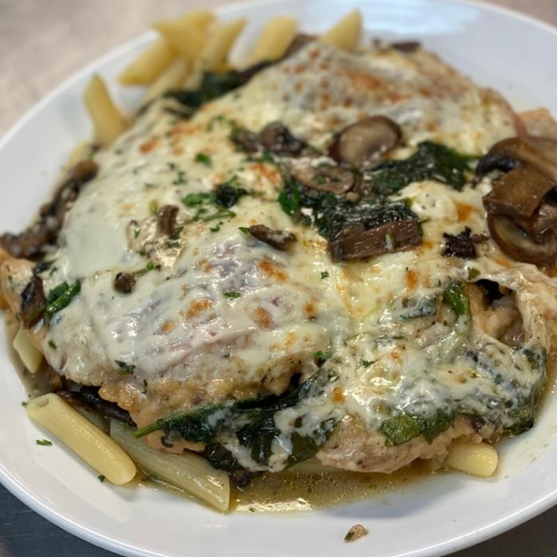 Sautéed with sliced ham, spinach and mushrooms in a buttery white wine sauce finished with melted mozzarella.